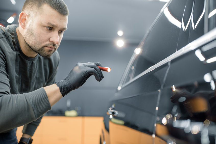 Worker examining vehicle body for scratches and damages backliting by a flashlight at the service. Checking car paint before vehicle detailing